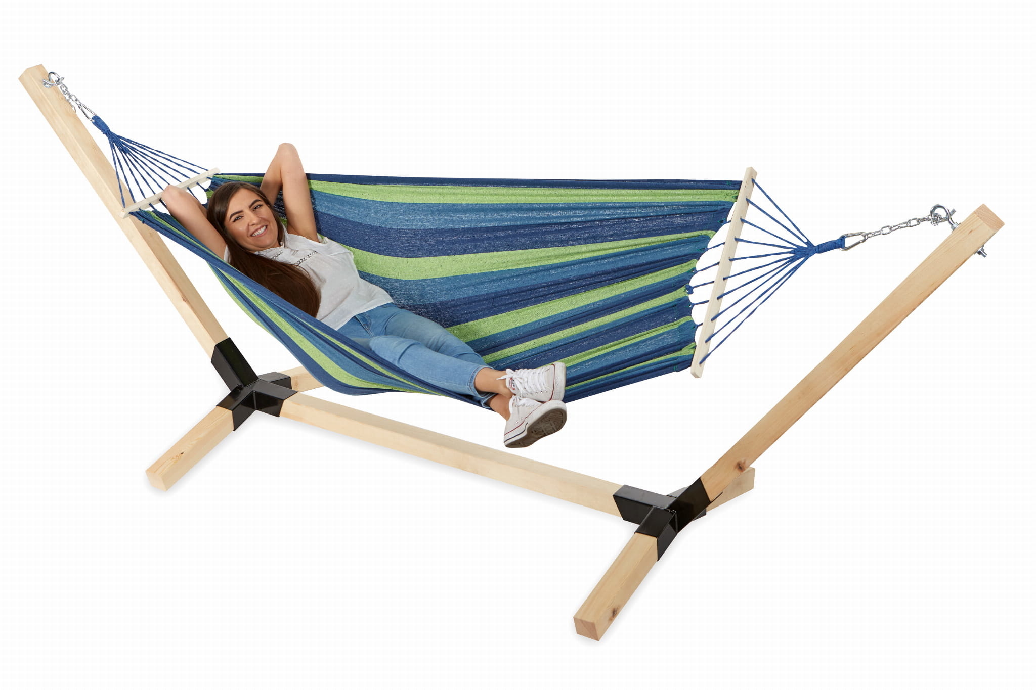 Het frame is erg stabiel en is gemaakt van sterke stalen profielen en massief houten vierkante palen. Het is eenvoudig en snel te monteren zonder gebruik van gereedschap. Alle houten onderdelen hoeven alleen in de profielen te worden geplaatst en klaar. De sterke haken om het hangmat aan op te hangen zorgen ervoor dat je tijdens het gebruik niet op de grond valt. Massieve lassen geven het frame een hoge sterkte en duurzaamheid. Inclusief hangmat.