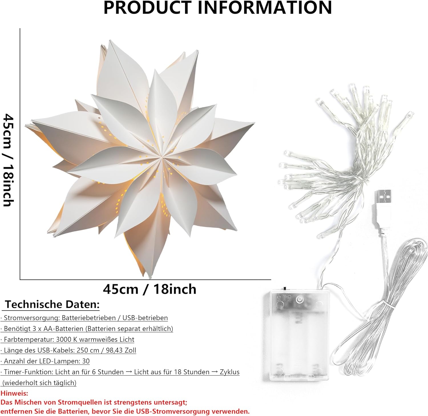 - Charmante 45 cm Papierstern-Dekoration mit zartem Blütenmuster und warmweißem Licht.